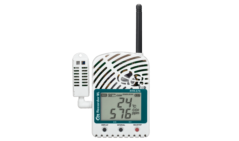 The RTR-500/RTR500B series allows you to mix and match an array of wireless radio communication loggers with various Base Units or Data Collectors to meet your needs. Logged data can be automatically sent via network or mobile communication to be saved in cloud storage or to a specified location. The RTR-576 is a three-channel data logger designed to measure and record CO2 concentration, temperature and humidity. External devices such as buzzers and lights can also be connected to the contact output terminal to provide instant on-site notification, signaling when ventilation may be needed.